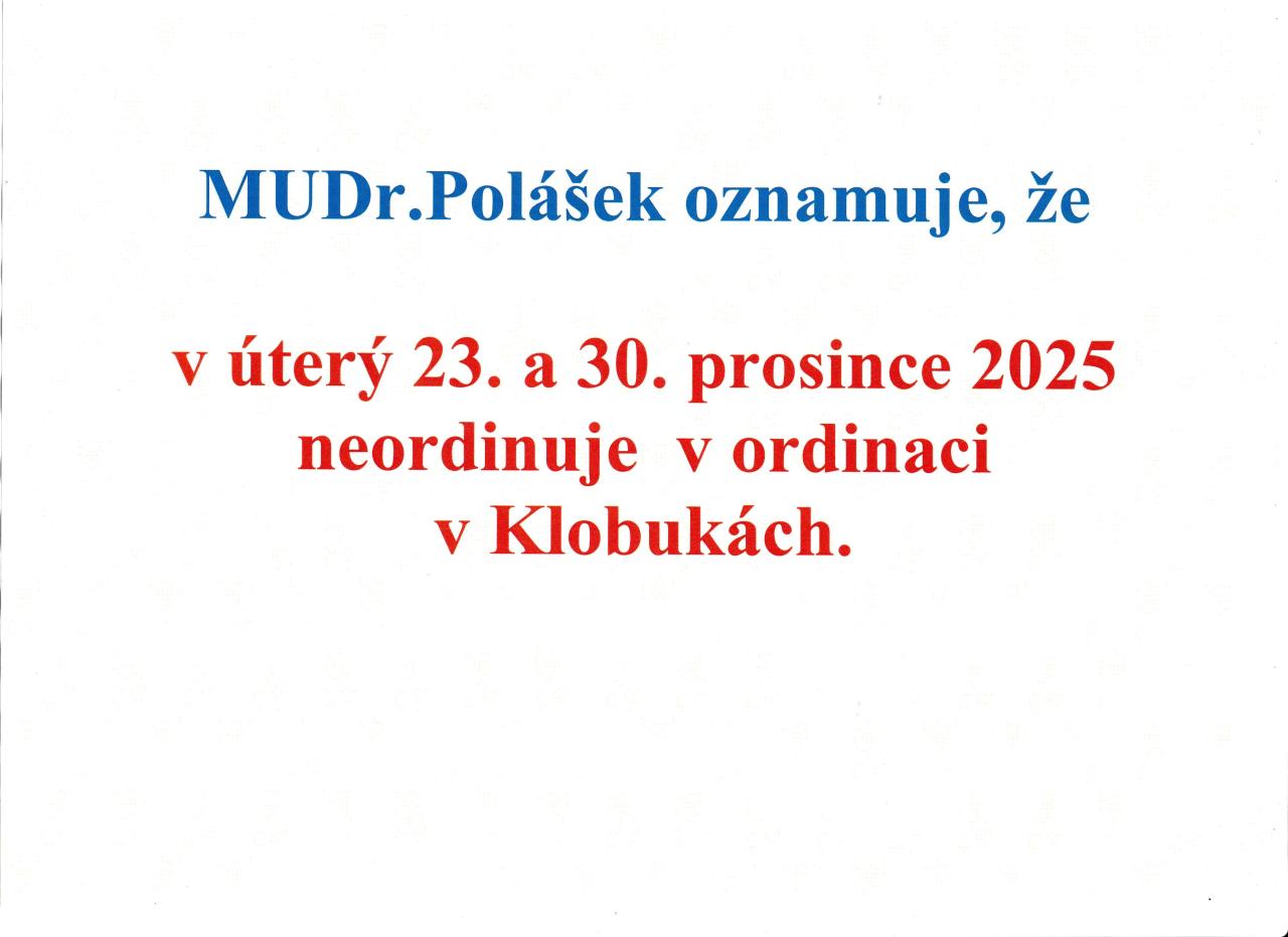 MUDr. Polášek oznamuje, že v úterý 23. a 30. prosince 2025 neordinuje v ordinaci v Klobukách. Prosíme pacienty, aby si naplánovali návštěvu v jiném termínu.